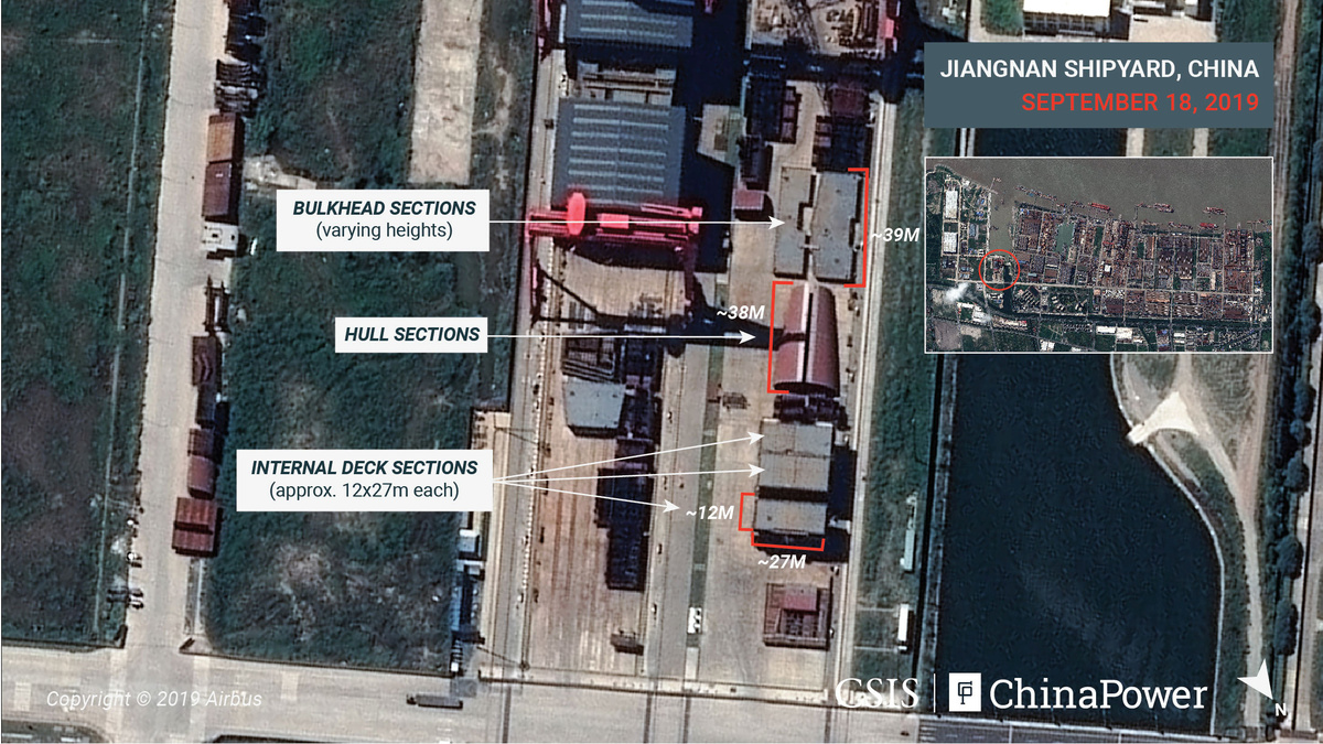 Noting a series of pre-fabricated sections, bulkheads and other components stacked nearby, CSIS analysts say the hull should be finished within 12 months, after which it is likely to be moved to a newly created harbour and wharf before being fitted out.