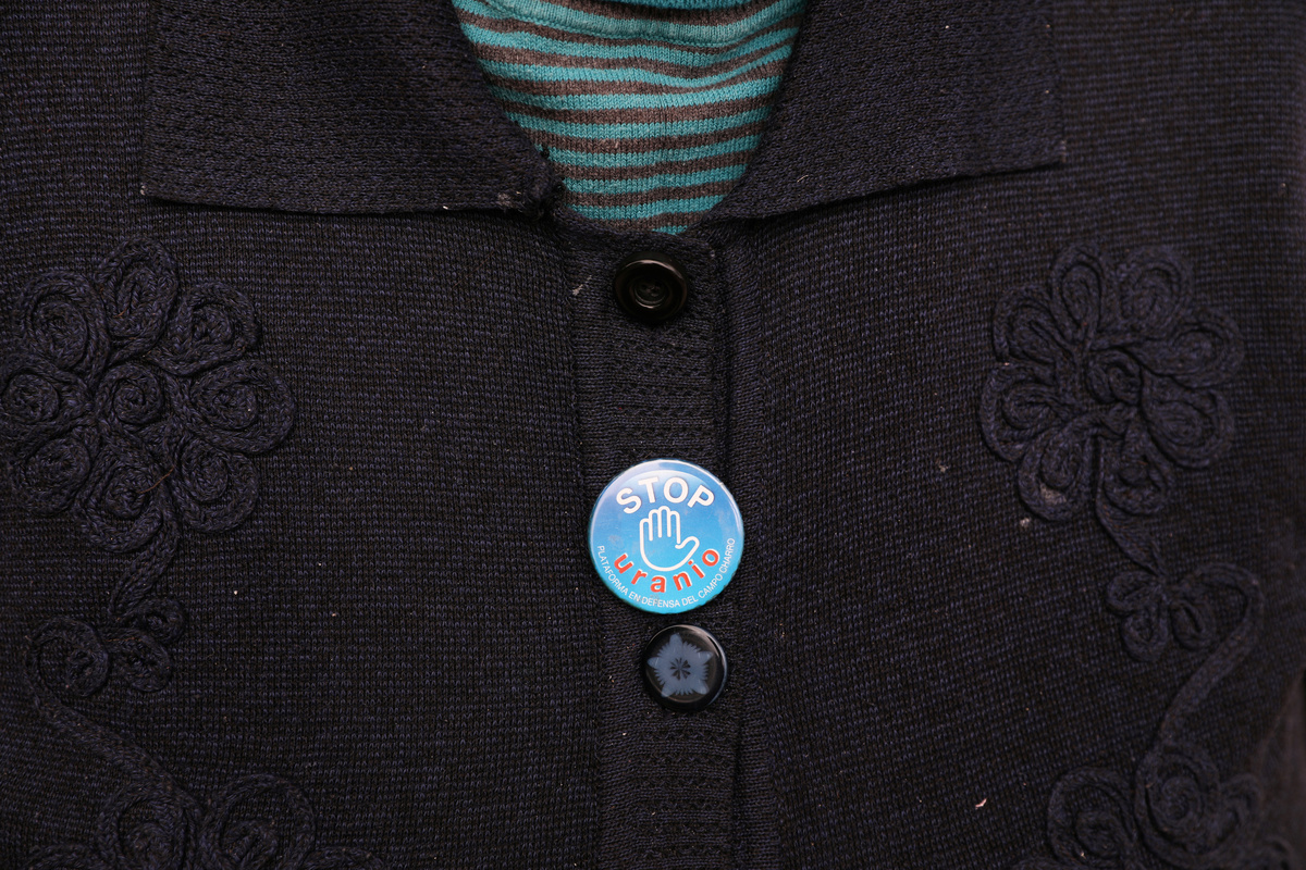 Eugenia Gonzalez wears a pin that reads "Stop Uranium" outside her house near the site of a planned open-cast uranium mine by Australian mining company Berkeley Energia in the village of Retortillo, near Salamanca, Spain, October 17, 2018. REUTERS/Susana Vera
