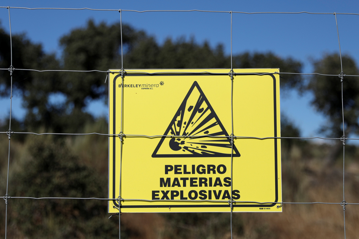 A sign reading "Danger Explosive Materials" is seen near the site of a planned open-cast uranium mine by Australian mining company Berkely Energia in the village of Retortillo, near Salamanca, Spain, October 17, 2018. REUTERS/Susana Vera
