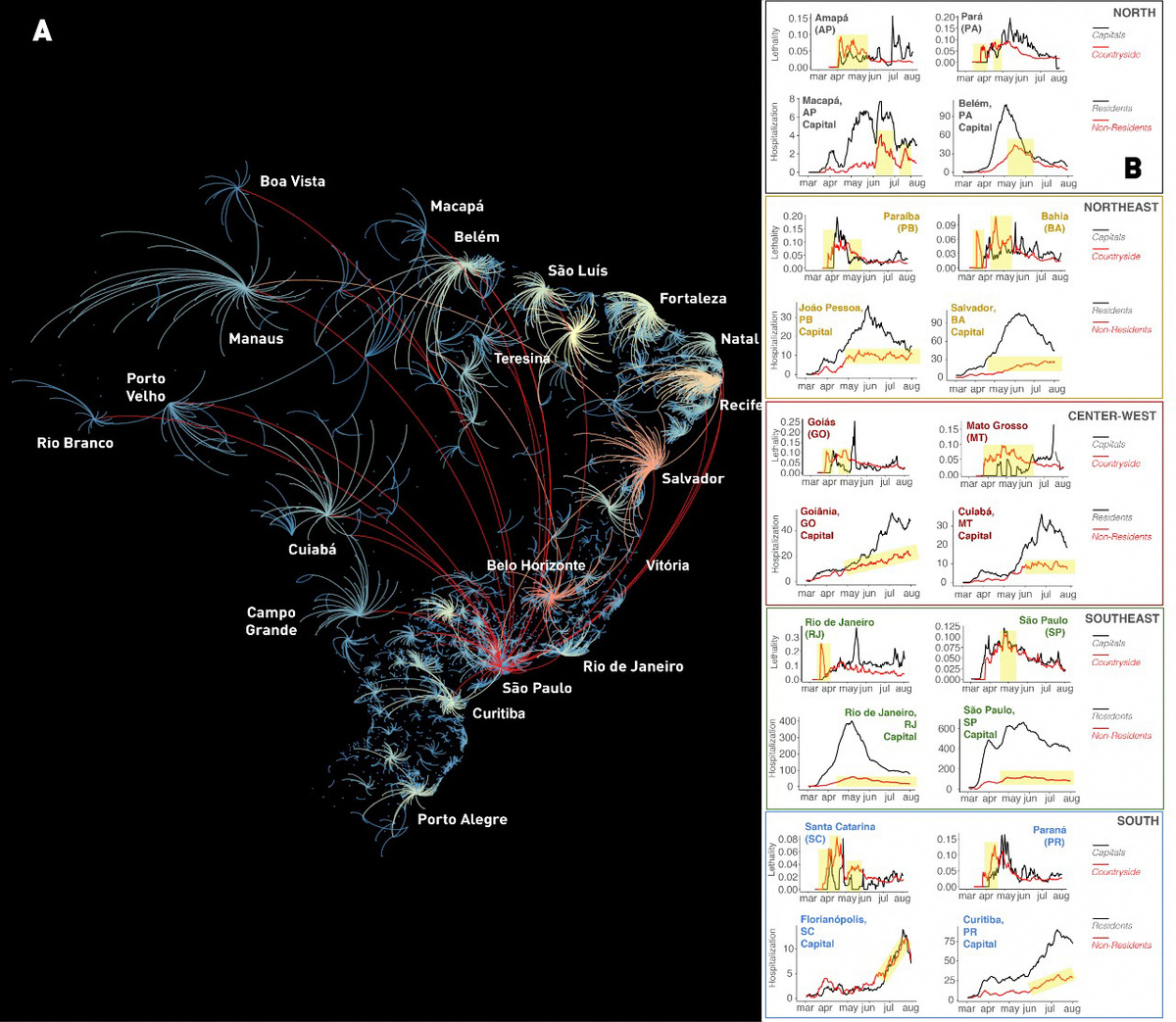 The representation of all COVID-19 "boomerangs" that occurred around major Brazilian state capitals and mid-size cities across the whole country, where arcs represent people flow from the interior towards the capital and the arc color code represents the number of interior cities that sent severely ill patients to be admitted in hospitals in a capital or mid-size town; red being the highest number of locations, orange and yellow next, while smaller number of locations are represented in light blue (A) and the lethality and hospitalization data, divided for residence source (interior and capital), for a sample of state capitals in all five regions of Brazil (B) are seen in this undated handout image. UFPB/Handout via REUTERS MANDATORY CREDIT NO RESALES. NO ARCHIVES THIS IMAGE HAS BEEN SUPPLIED BY A THIRD PARTY.