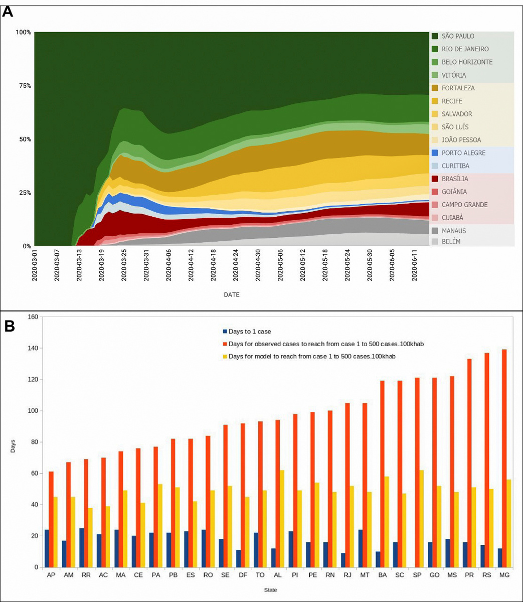 Graphs show the individual contribution of the Brazil's 17 state capital cities that were responsible for 98 percent of spreading of COVID-19 cases for the 5570 Brazilian municipalities, from March 1st to June 11th (above), and the day of identification of the first COVID-19 case in each state (using Sao Paulo'S first case on February 26, 2020 as the 0 reference), and the number of days estimated by a mathematical model for each state to reach 500 cases per 100 thousand inhabitants and the days in which each of Brazilian states actually reached the mark of 500 cases per 100 thousand inhabitants (below) in this undated handout image. UFPB/Handout via REUTERS MANDATORY CREDIT NO RESALES. NO ARCHIVES THIS IMAGE HAS BEEN SUPPLIED BY A THIRD PARTY.The distribution of ICU beds across all Brazil (above), and the superimposition of the COVID-19 death distribution (color code legend on the left lower corner) on top of the ICU bed distribution (below) are seen in this undated handout image. UFPB/Handout via REUTERS MANDATORY CREDIT NO RESALES. NO ARCHIVES THIS IMAGE HAS BEEN SUPPLIED BY A THIRD PARTY.Maps of Brazil representing the routes of the main federal highways, the evolution of the geographic distribution of COVID-19 cases on three dates (April 1st, June 1st and August 1st), and the distribution of COVID-19 deaths on August 1st are seen in this undated handout image. UFPB/Handout via REUTERS MANDATORY CREDIT NO RESALES. NO ARCHIVES THIS IMAGE HAS BEEN SUPPLIED BY A THIRD PARTY.