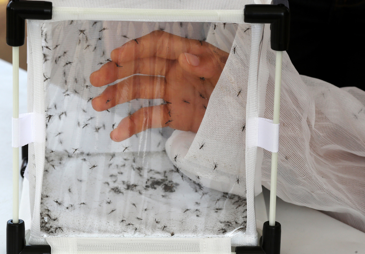 A girl puts her hand in a box with male genetically modified Aedes aegypti mosquitoes at an educational exhibition by British biotechnology company Oxitec in Piracicaba March 5, 2015. REUTERS/Paulo Whitaker