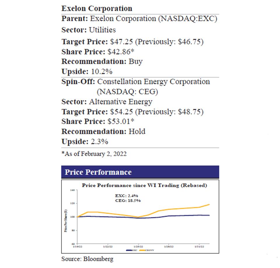 We value Exelon Corp. (EXC) using 2022e PE methodology. Our intrinsic value of $47.25 (Previously: $46.75) for EXC is based on a 2022e P/E multiple of 20.2x (~5% premium to its peer median multiple of 19.2x). We initiate coverage on Exelon with a ‘Buy’ rating and an implied upside of 10.2% from the current market price of $42.86 as of 2/2. Constellation Energy is one of the largest producer of carbon-free energy and the leading competitive retail supplier of power and energy products and services. It is helping to accelerate US’s transition to clean energy with more than 32,400 megawatts of capacity and annual output that is 90% carbon-free. Our fair value estimate for CEG (Spin-Off) stands at $54.25 (Previously: $48.75) based on 2022e EV/EBITDA multiple of 7.8x (at a slight premium to its peer median multiple of 7.7x). We initiate coverage on Constellation Energy (Spin-Off) with a ‘Hold’ rating and an implied upside of 2.3% from the current market price of $53.01 as of 2/2. Risks to our valuation include regulatory requirements regarding the operation and maintenance of nuclear plants, which could significantly increase costs, resulting in a change to earnings expectations, changes by federal and state regulation in the gas and electric markets, which can affect the operations.