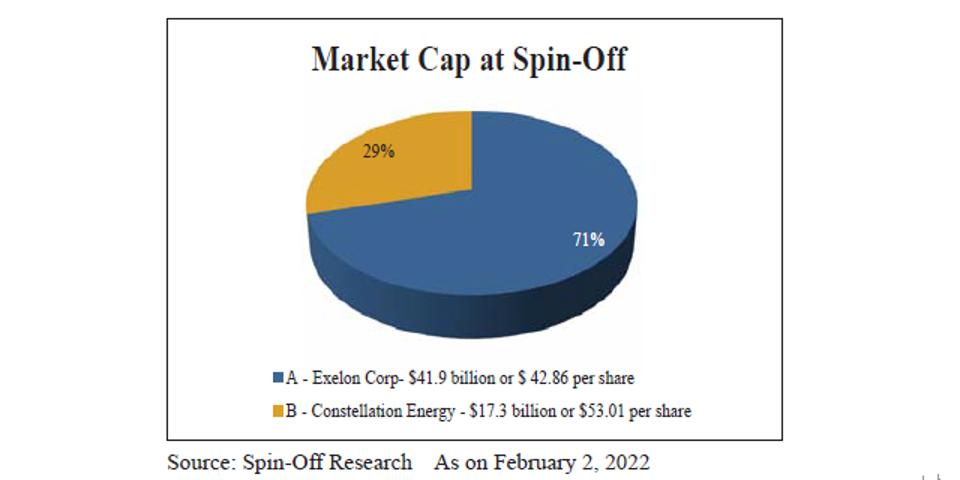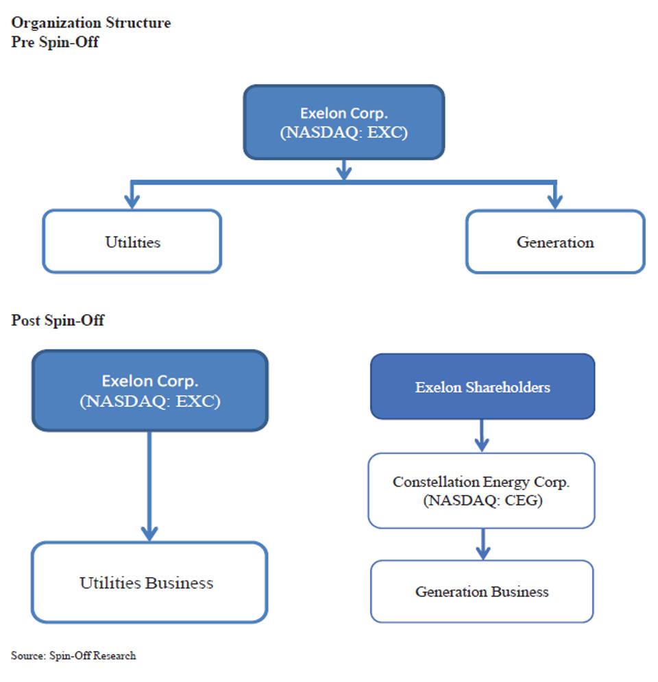 Exelon distributed 100% of the outstanding shares of common stock of its wholly owned subsidiary, Constellation Energy (CEG), to EXC stockholders on a pro-rata basis. EXC shareholders received one ordinary share of CEG for every three ordinary shares of EXC held as of the record date of 1/20. Post spin-off, EXC comprises Exelon’s fully regulated transmission and distribution utilities, positioning it to deliver smart, clean, reliable, and resilient energy to its customers while fostering economic opportunity and equity in the diverse communities it serves. Constellation Energy is a competitive generation and customer-facing company with the agility to adapt to a rapidly changing energy landscape as the nation’s largest provider of clean energy and leading integrated platform for sustainable energy solutions.