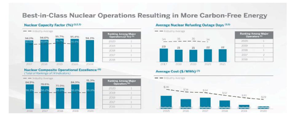 Constellation’s nuclear energy fleet has run over 94% levels since 2013, which is 4% better than the industry average of 90%-91%, and had a 2020 refuelling outage duration of 22 days, 11 days below the industry average. The resulting increase in carbon-free electricity is equivalent to taking more than 1.1 million passenger cars off the road each year, according to Environmental Protection Agency emissions data.