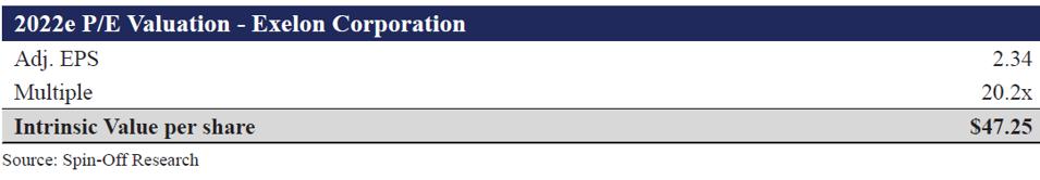 P/E Valuation: Our intrinsic value of $47.25 (Previously: $46.75) for EXC is based on a 2022e P/E multiple of 20.2x (~5% premium to its peer median multiple of 19.2x). Premium to the median multiple factors in the company’s solid investment plans, which involves a target of ~$29B of T&D capital from 2022-2025 to meet customer needs, resulting in expected rate base growth of 8.1% and fully regulated operating EPS growth of 6-8% from 2021-2025. Exelon also targets a ~60% dividend payout ratio of operating earnings and growth in line with those earnings through 2025. Risks to our valuation include regulatory requirements regarding the operation and maintenance of nuclear plants, which could significantly increase costs, resulting in a change to earnings expectations, changes by federal and state regulation in the gas and electric markets, which can affect the operations, changes in the price of fuel or fuel transportation such as coal or rail services.