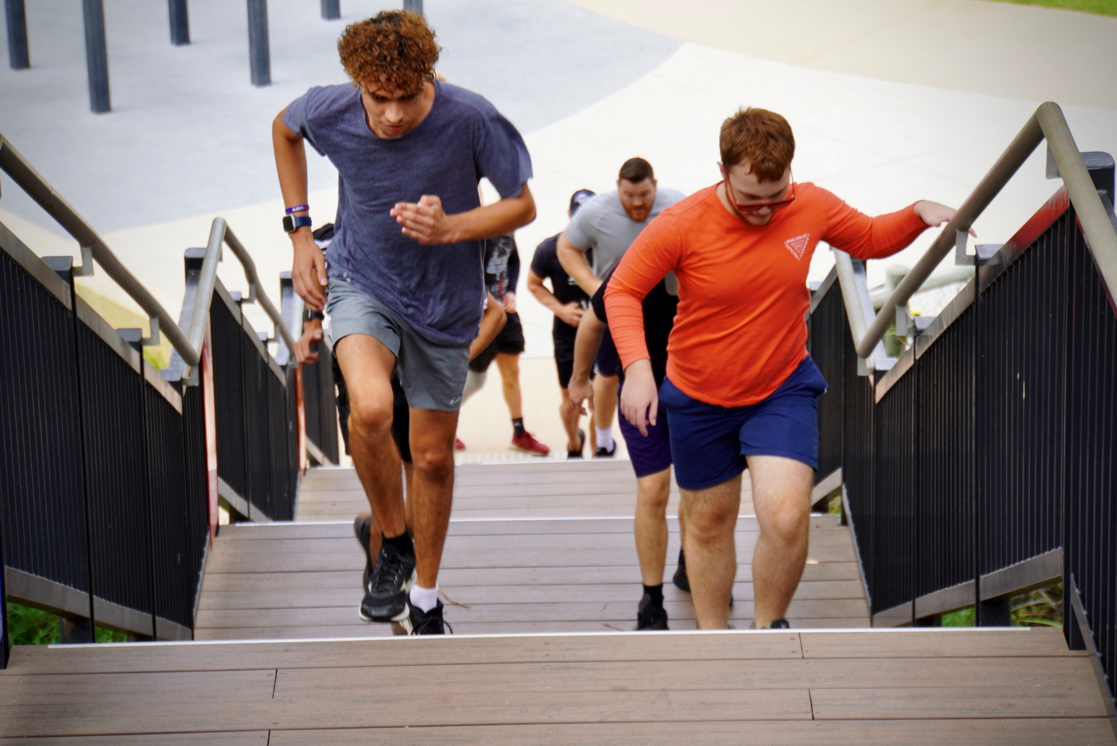 Participants work-out using outdoor exercise equipment and stairs at a beachside location.