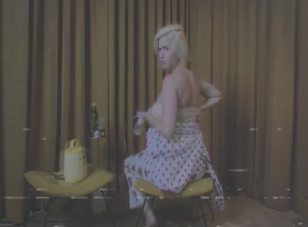 In another clip, Perry spies on her fiancé as he performs bicep curls while she eats a snack.