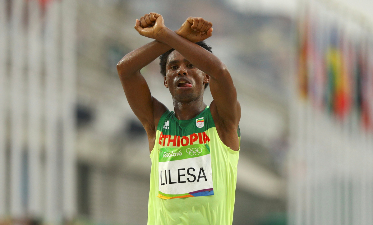 Feyisa Lilesa held his arms over his head, wrists crossed, as he finished second in the marathon in the Rio de Janeiro Olympics, a gesture used by protesters in Ethiopia's Oromiya region during a period of unrest in 2015-2017.