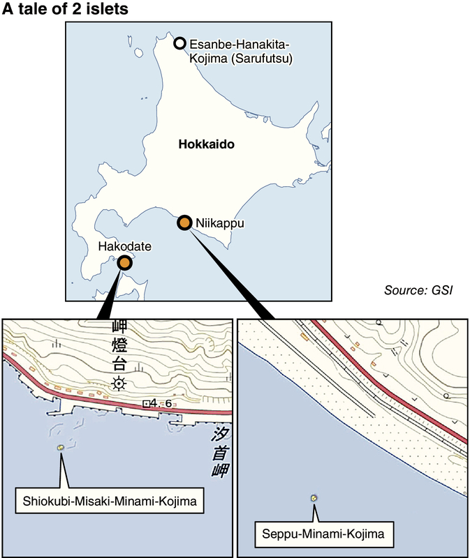 The two islets, Seppu-Minami-Kojima and Shiokubi-Misaki-Minami-Kojima, are located in waters off Hokkaido and used to be about hundred square meters each, according to sources.