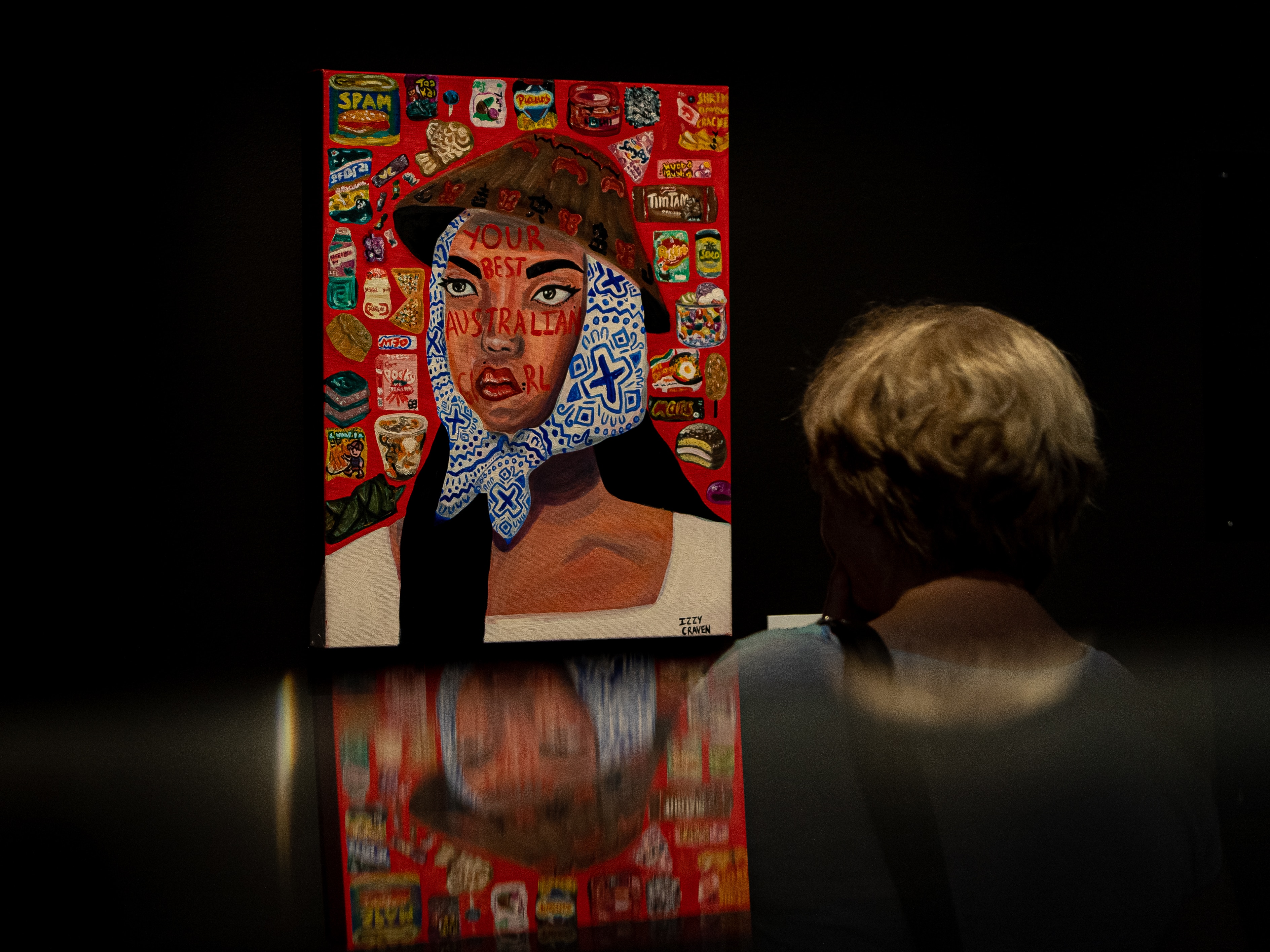 Titled 'Your Best Australian Girl', Izzy's tongue-in-cheek self-portrait features a scarf made by her Filipino grandmother, a traditional Korean hat from her mother and an assortment of Asian and Western food products.