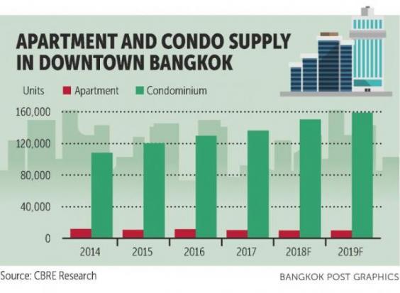 Based on the latest survey by CBRE Research, "expatriate standard" single-ownership apartment buildings in downtown Bangkok contain a total of only 10,000 units. By comparison, there were 80,000 condominium units in the same preferred expatriate rental locations. CBRE estimates 35-40% of these units are owned by buy-to-rent investors. There is limited new apartment supply, but continued growth in condominium supply.