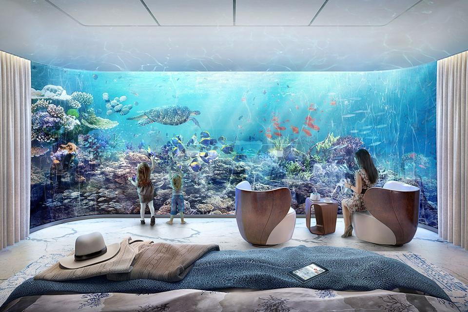 The submerged floor contains the primary bedroom and a bathroom. A floor-to-ceiling rounded-corner window in the bedroom lets in views of the sea life. Colorful denizens of the man-made coral reef include the striped clown fish, the blue angel fish and pink anemones.