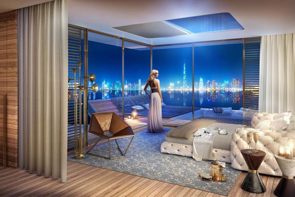 The uppermost level features another deck, a mini bar, a kitchenette and a glass-bottomed hot tub. Vistas take in the skyline of Dubai and the Persian Gulf.