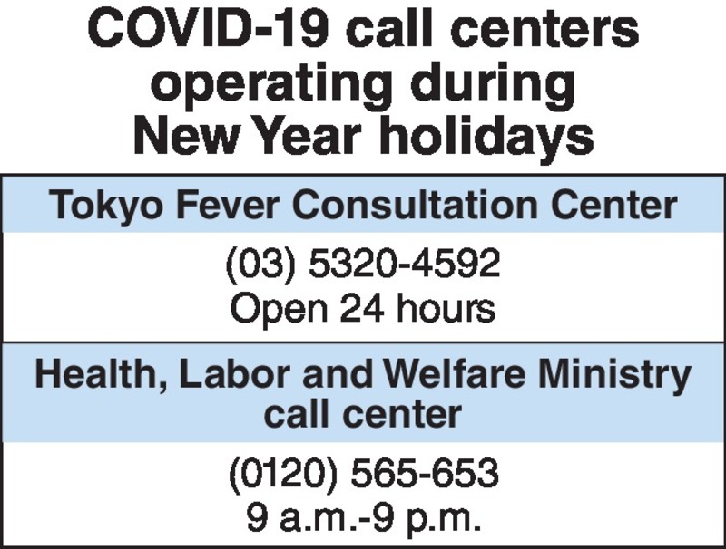 The Health, Labor and Welfare Ministry has a toll-free number that people around the nation can call if they fear they might be infected, and the Tokyo Fever Consultation Center has a 24-hour line for concerned Tokyo residents. English consultations are available at both numbers, which are shown in the box accompanying this story.