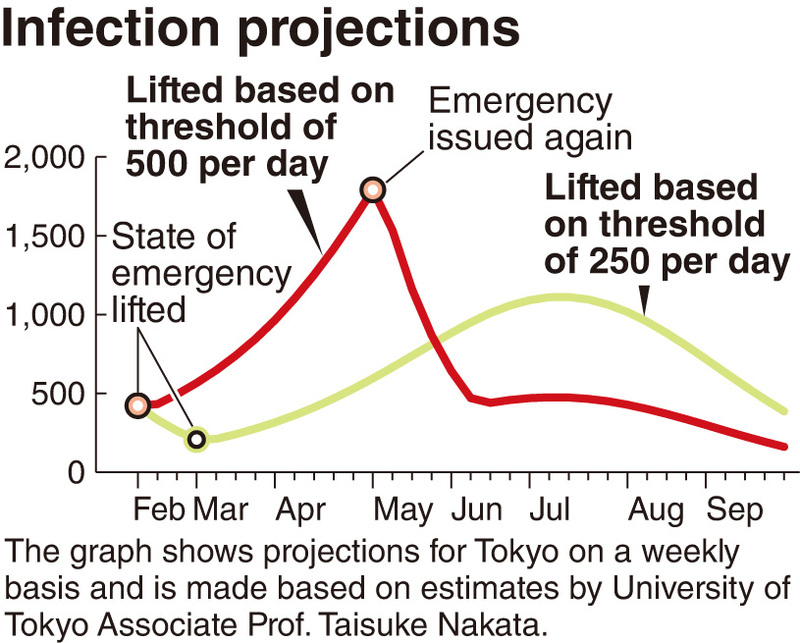 One of the government's criteria for lifting the state of emergency in Tokyo is a threshold of no more than 500 new daily coronavirus cases, but experts have argued that unless the figure is lower, the number of infections would rebound soon after the state of emergency was lifted, resulting in huge economic losses.