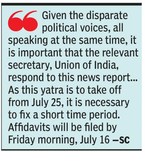 The bench said: "Given the fact that this yatra is to take off from July 25, it is necessary to fix a short time period for this case. Affidavits will be filed by Friday morning, July 16, responding to the aforesaid news article…"