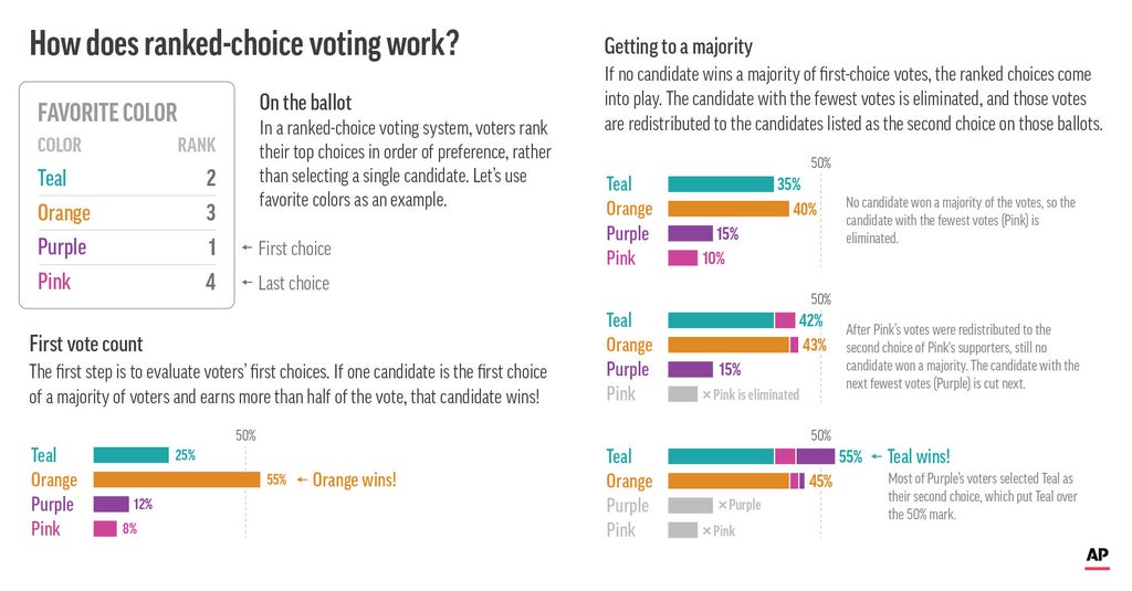 Rather than pick just one candidate, voters get to rank several in order of preference. Even if a voter's top choice doesn't have enough support to win, their rankings of other candidates still play a role in determining the victor.