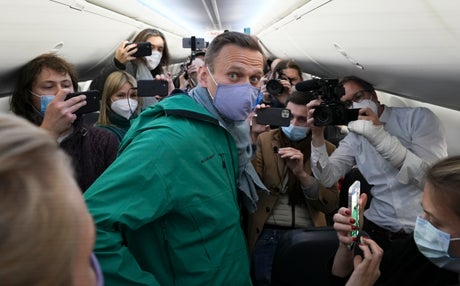 The Jan. 17 flight from Berlin where Navalny spent nearly five months recovering from a nerve agent poisoning, carried him and his wife, along with a group of journalists documenting the journey. But the plane was diverted from its intended airport in Moscow to another one in the capital in what was seen as an apparent attempt to foil a welcome from crowds awaiting him.