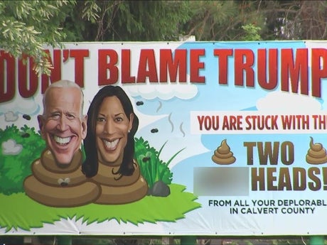An explicit billboard depicting the heads of President Joe Biden and Vice President Kamala Harris on top of piles of faeces, and referring to them as “s**t heads” is causing a controversy in Maryland.