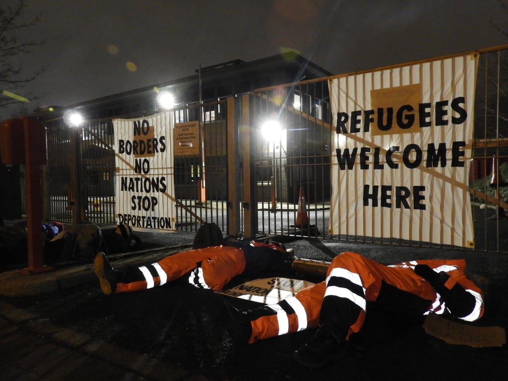 Photos of the scene in Glasgow on Monday show the protesters taking action in solidarity with those in London, with banners saying “Refugees Welcome”, “End the Hostile Environment” and “Climate Justice = Migrant Justice”.