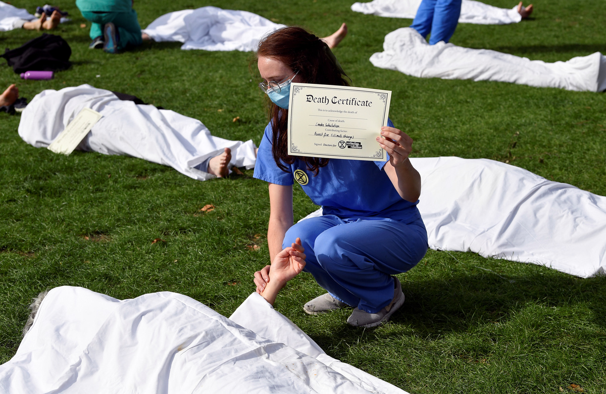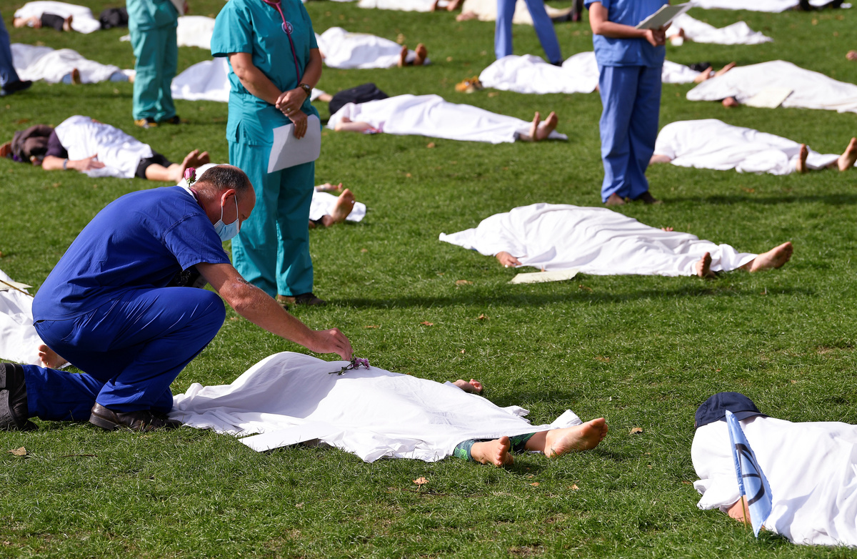 Extinction Rebellion activists and health workers participate in a "peaceful disruption" of the British Parliament as lawmakers return from summer recess, in London, Britain September 2, 2020. REUTERS/Toby MelvilleAn Extinction Rebellion activist participates in a "peaceful disruption" of the British Parliament as lawmakers return from summer recess, in London, Britain September 2, 2020. REUTERS/Toby Melville