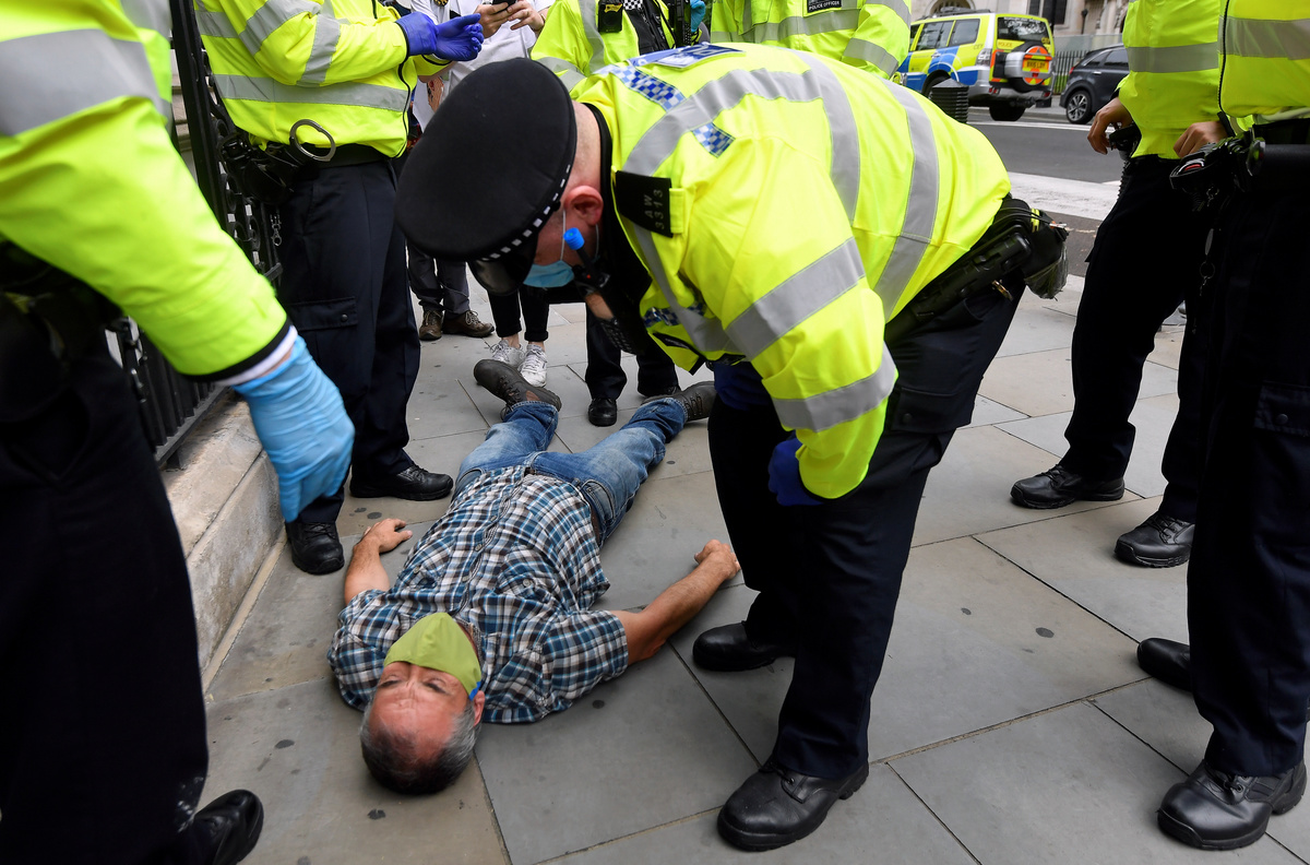 Police officers detain an Extinction Rebellion climate activist during a "peaceful disruption" of British Parliament as lawmakers return from the summer recess, at Parliament Square in London, Britain September 2, 2020. REUTERS/Toby Melville