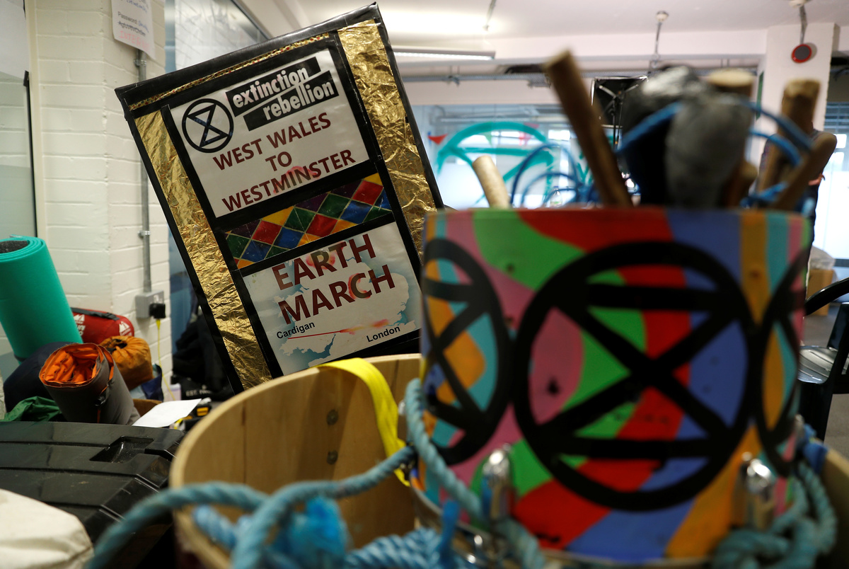 Extinction Rebellion's headquarters in London look like a grungy version of a tech start-up. Activists with laptops sit at cluttered desks or on run-down furniture amid bags of clothes, boxes of campaign literature and mock skeletons.