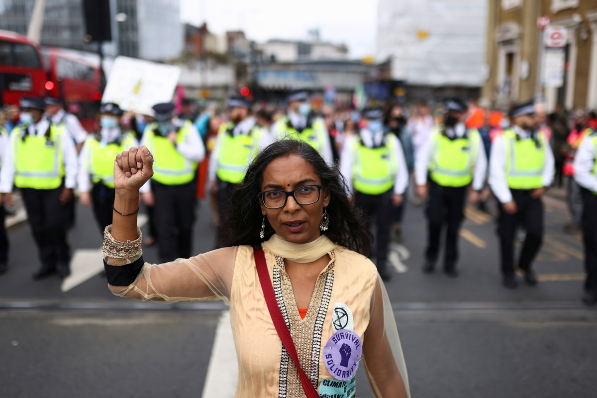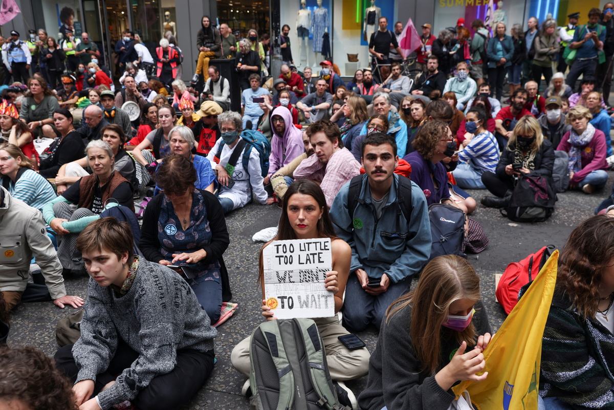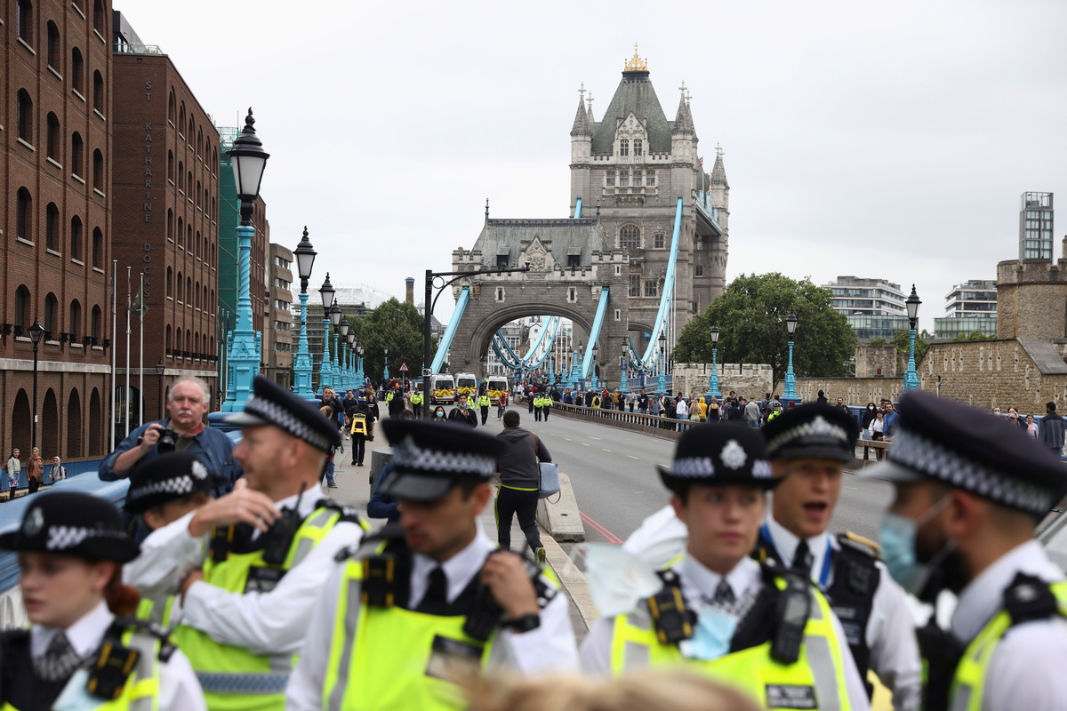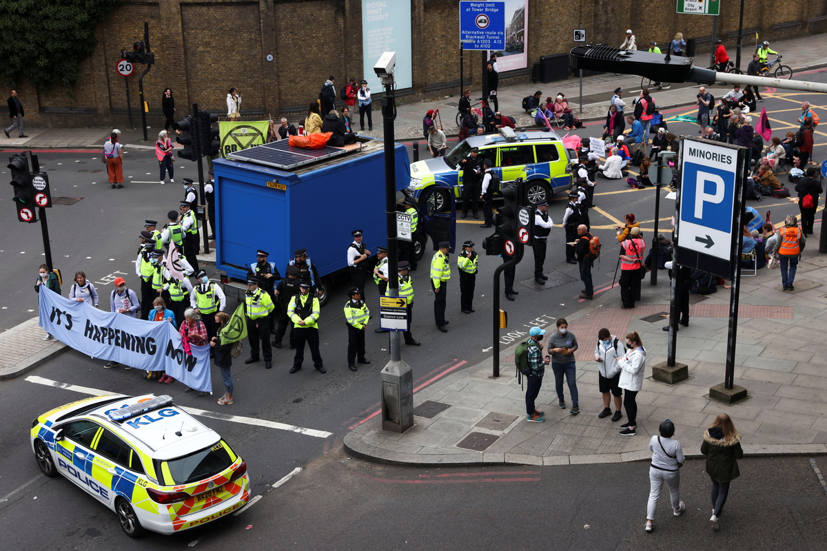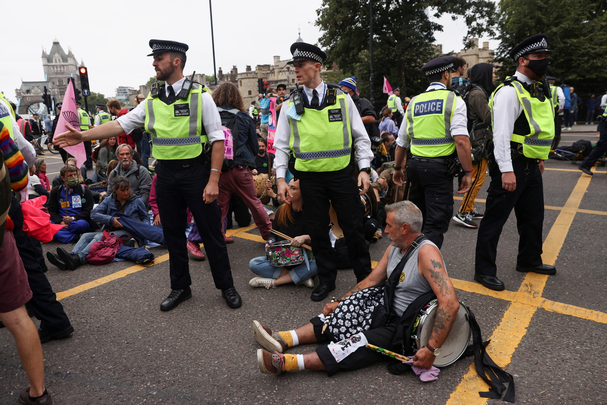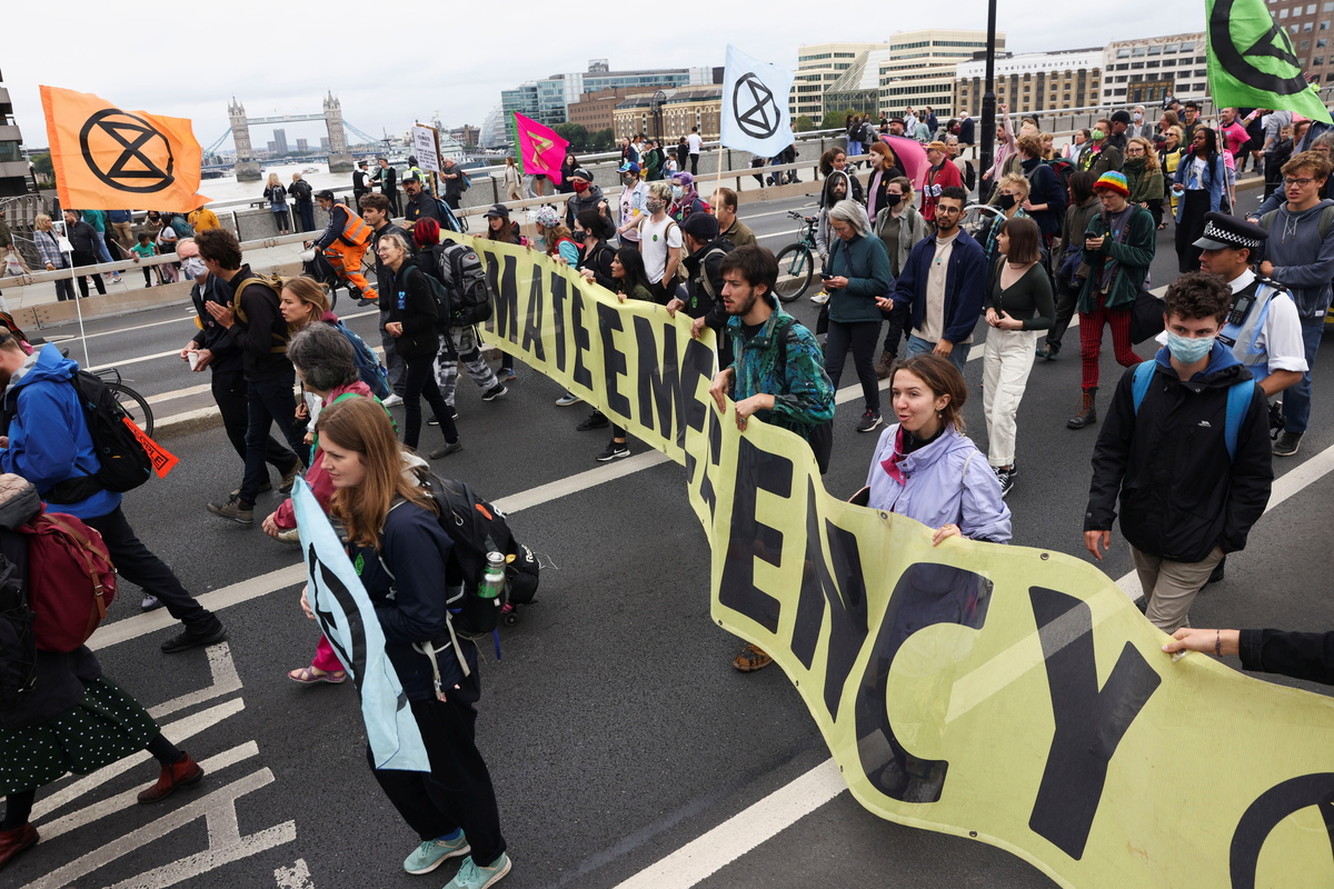 Demonstrators from the Extinction Rebellion group, which is demanding urgent action by governments and business to limit climate change and biodiversity loss, staged a sit-down protest that stopped traffic from using Tower Bridge in London on Monday.