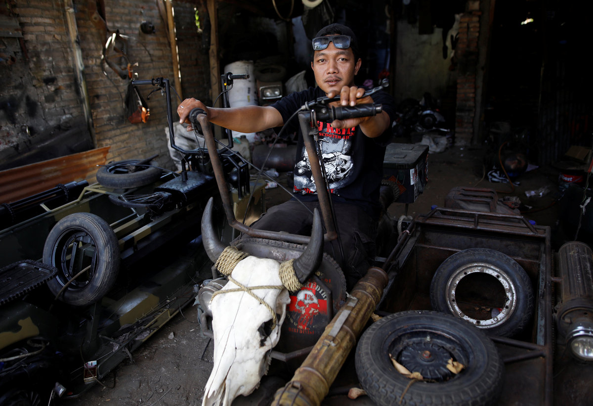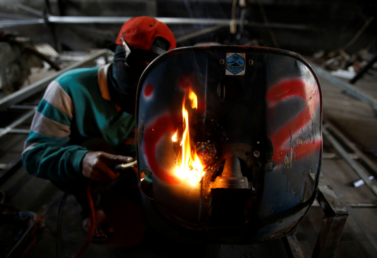 A mechanic works on turning an old Vespa bike into an extreme tank to sell at a workshop in Kediri, East Java, Indonesia, August 3, 2018. REUTERS/Darren Whiteside