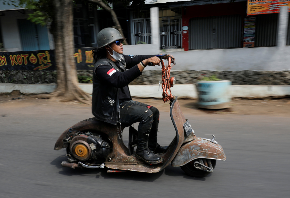 An extreme Vespa enthusiast rides his bike after attending weekend festival for extreme Vespas in Semarang, Central Java, Indonesia, July 22, 2018. REUTERS/Darren Whiteside