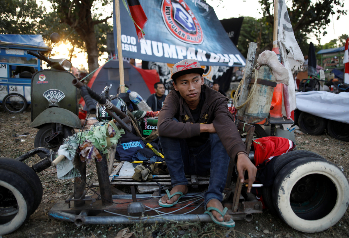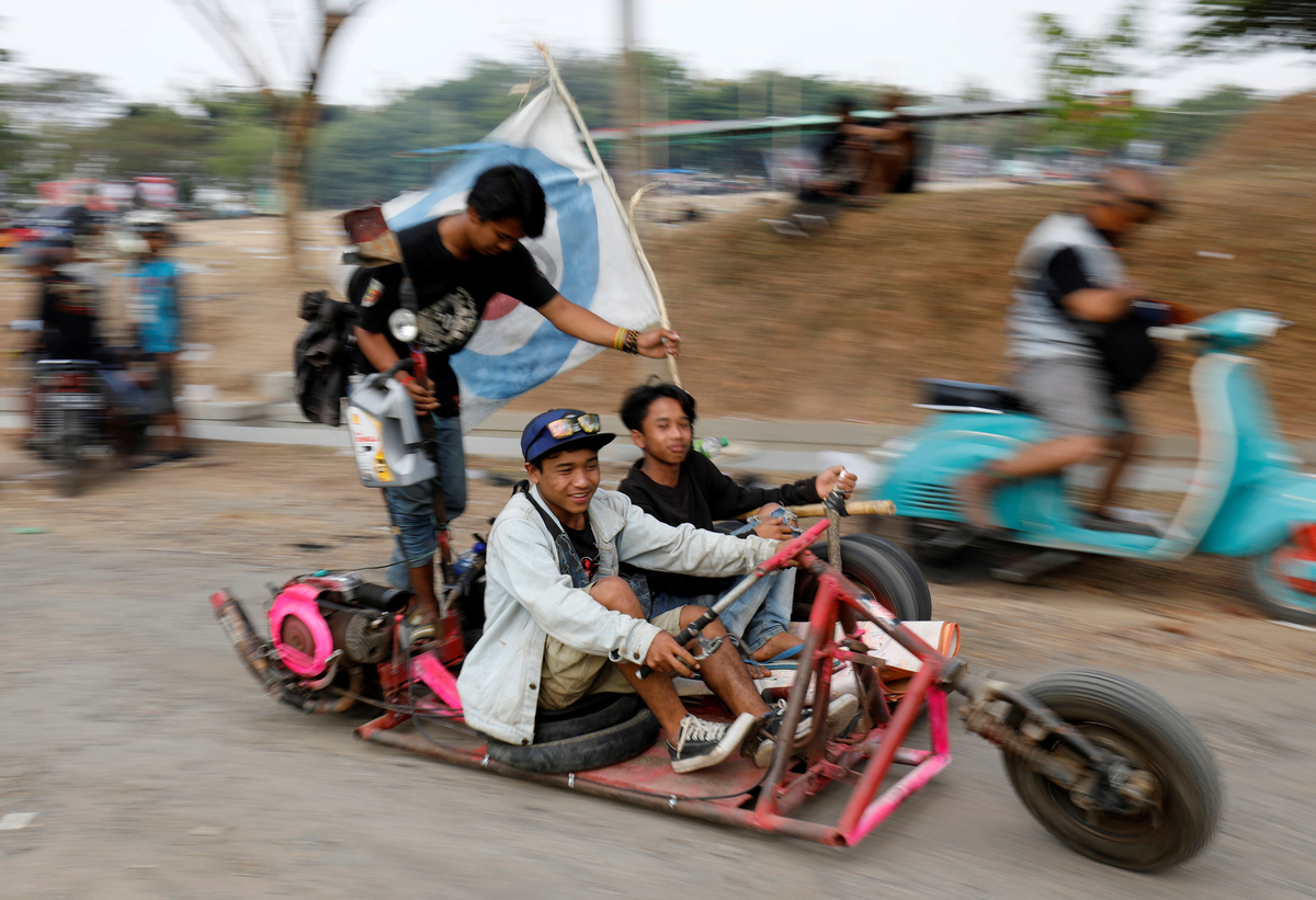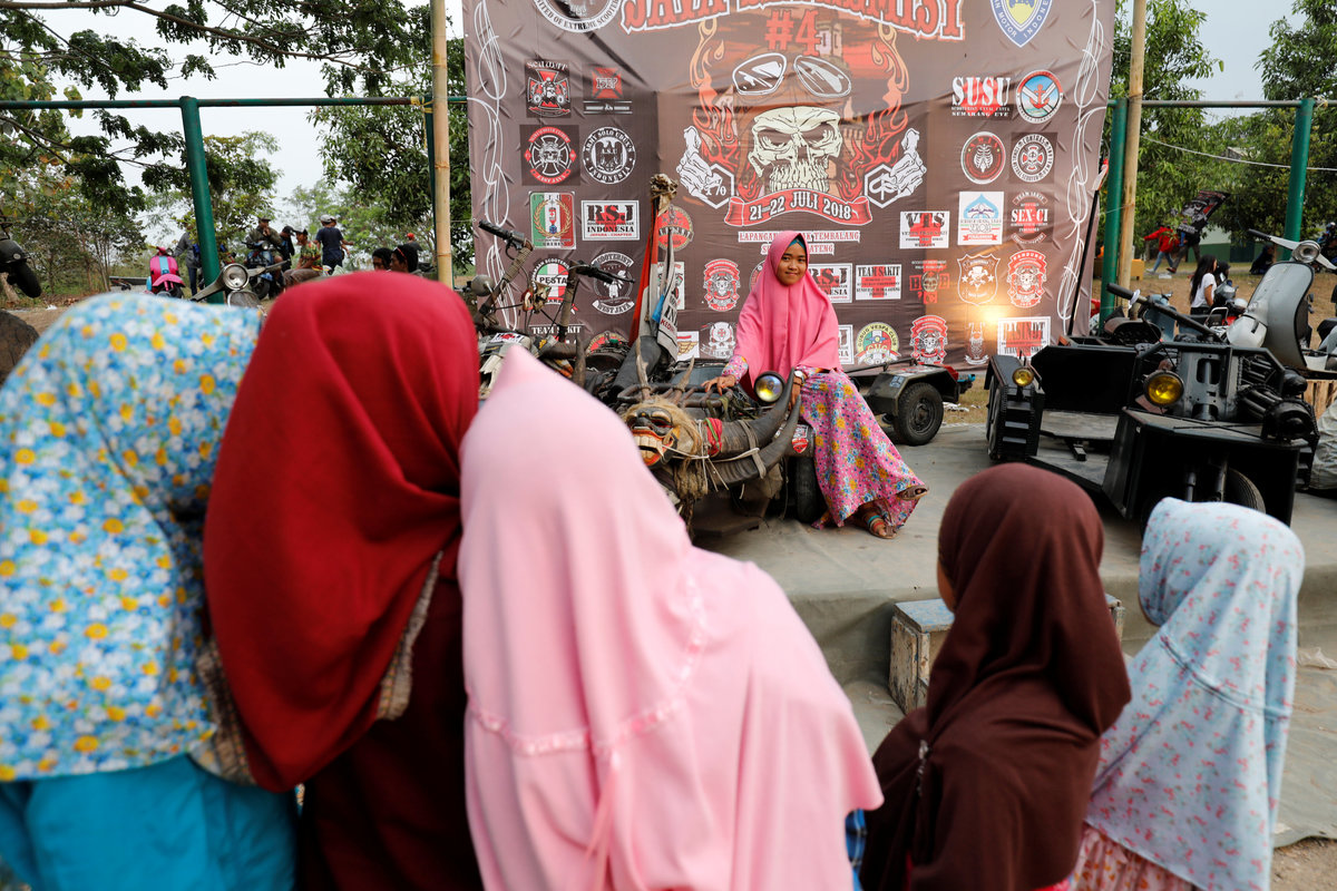 A rider wears a modified helmet and mask while attending a weekend festival for extreme Vespas in Semarang, Central Java, Indonesia, July 22, 2018. REUTERS/Darren WhitesideExtreme Vespa enthusiasts drive near the site of a weekend scooter festival in Kediri, East Java, Indonesia, August 5, 2018. REUTERS/Darren Whiteside Extreme Vespa enthusiasts drive near the site of a weekend scooter festival in Kediri, East Java, Indonesia, August 5, 2018. REUTERS/Darren WhitesideVespa enthusiasts dance at a music concert at a scooter festival in Kediri, East Java, Indonesia, August 4, 2018. REUTERS/Darren Whiteside Vespa enthusiasts ride their bike after attending a weekend festival for extreme Vespas in Semarang, Central Java, Indonesia, July 22, 2018. REUTERS/Darren WhitesideVespa enthusiasts take part in a Vespa-cross race at a scooter festival in Kediri, East Java, Indonesia, August 4, 2018. REUTERS/Darren Whiteside Extreme Vespa enthusiasts drive near the site of a scooter festival in Kediri, East Java, Indonesia, August 4, 2018. REUTERS/Darren Whiteside An extreme Vespa enthusiast sits on his bike as he watches a concert at a weekend scooter festival in Kediri, East Java, Indonesia, August 4, 2018. REUTERS/Darren Whiteside A stuffed toy mascot is tied to the back of an extreme Vespa at a weekend festival for extreme Vespas in Semarang, Central Java, Indonesia, July 22, 2018. REUTERS/Darren Whiteside Vespa enthusiasts take part in a Vespa-cross race at a scooter festival in Kediri, East Java, Indonesia, August 4, 2018. REUTERS/Darren Whiteside Local girls take pictures of their friend sitting on a modified extreme Vespa while briefly visiting an extreme Vespa festival in Semarang, Central Java, Indonesia, July 21, 2018. REUTERS/Darren Whiteside Vespa enthusiasts dance to a live band at a weekend scooter festival in Kediri, East Java, Indonesia, August 4, 2018. REUTERS/Darren Whiteside Vespa enthusiasts watch a concert from the roof of a truck at a scooter weekend festival in Kediri, East Java, Indonesia, August 5, 2018. REUTERS/Darren WhitesideExtreme Vespa enthusiasts sleep during a weekend scooter festival in Kediri, East Java, Indonesia, August 4, 2018. REUTERS/Darren Whiteside Extreme Vespa enthusiast Julia Ningsih, 19, attends a weekend scooter festival in Kediri, East Java, Indonesia, August 4, 2018. REUTERS/Darren Whiteside A stuffed toy mascot is tied to the front of a modified Vespa at a weekend festival for extreme Vespas in Semarang, Central Java, Indonesia, July 22, 2018. REUTERS/Darren Whiteside