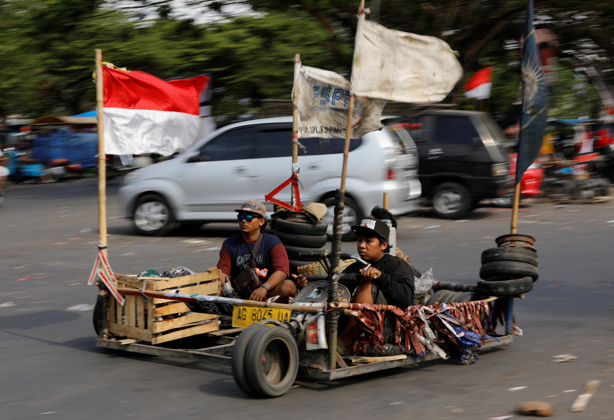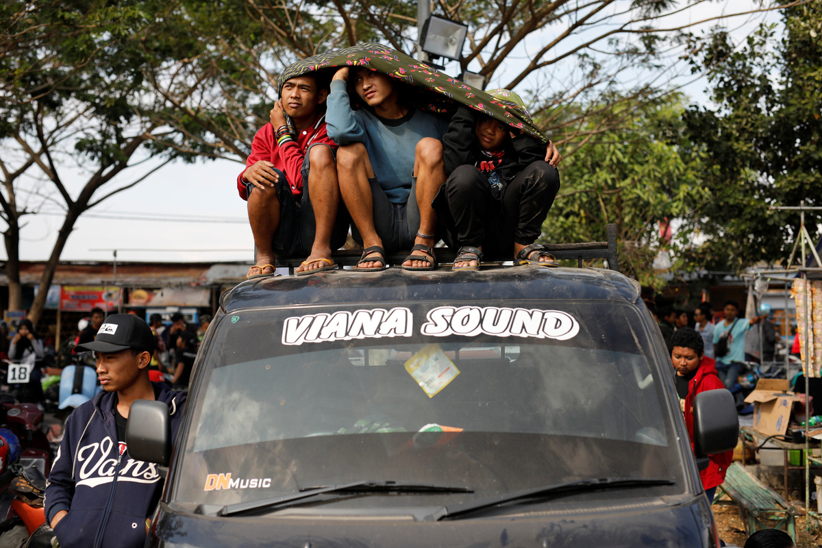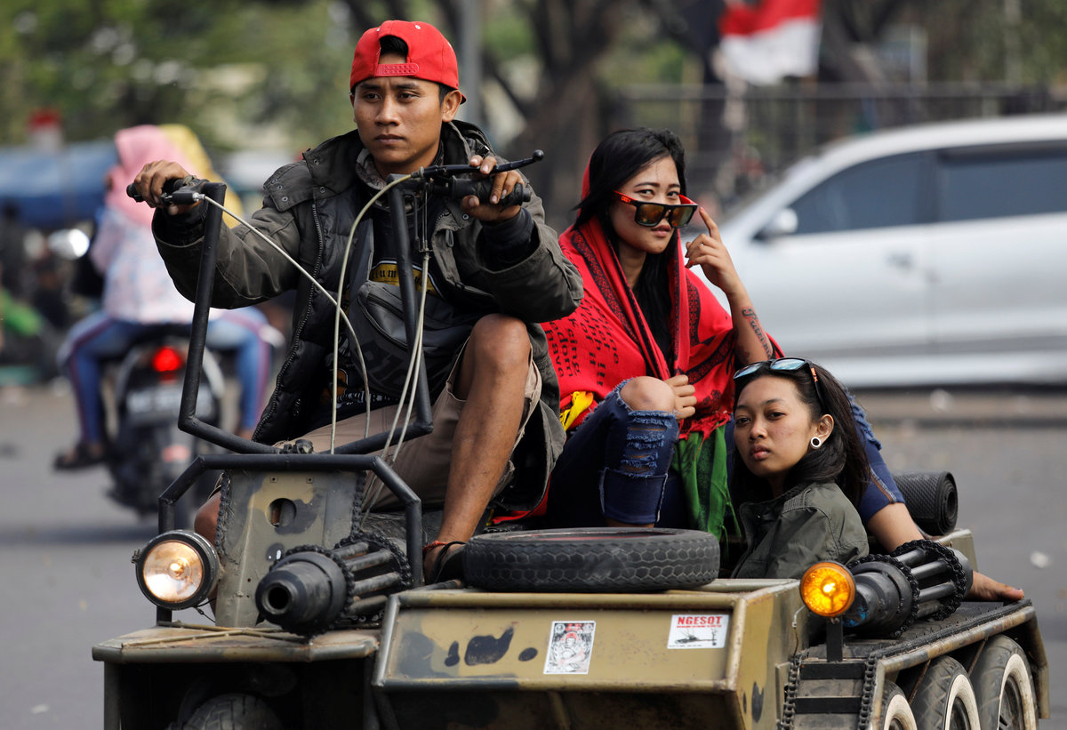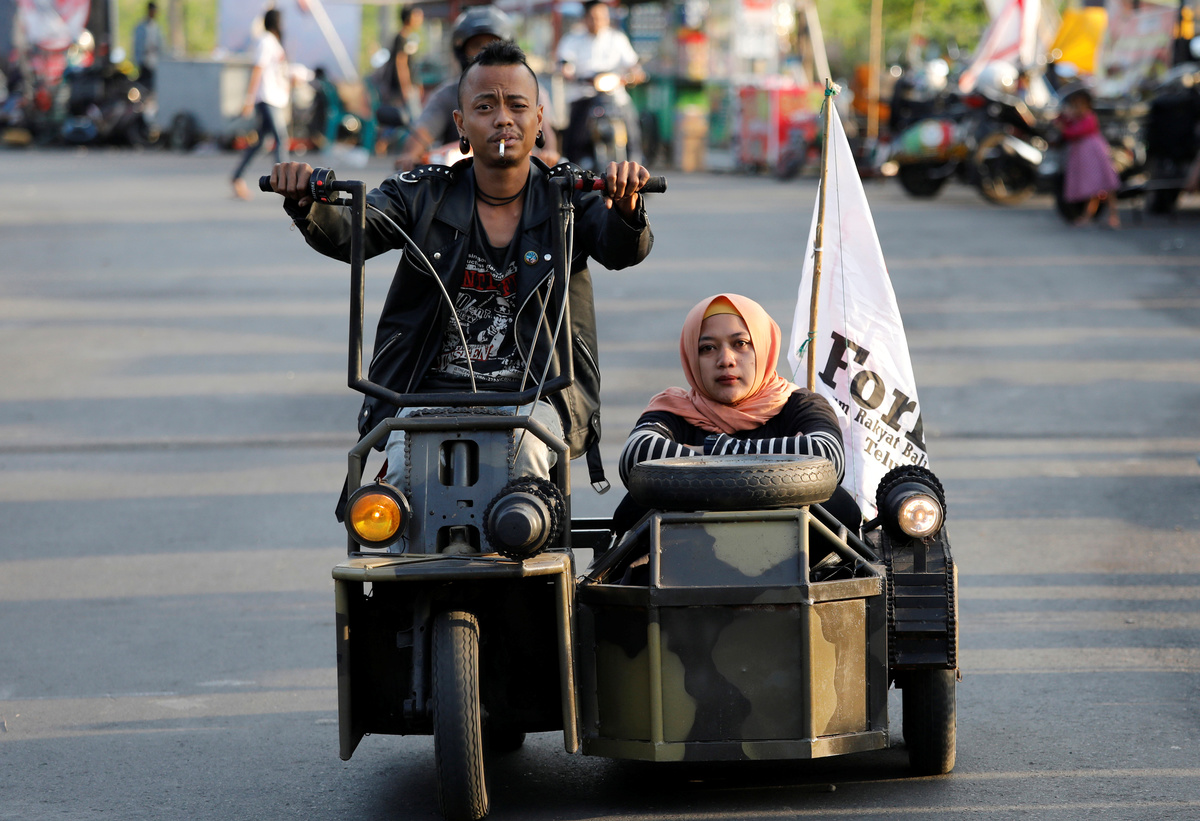 A rider wears a modified helmet and mask while attending a weekend festival for extreme Vespas in Semarang, Central Java, Indonesia, July 22, 2018. REUTERS/Darren WhitesideExtreme Vespa enthusiasts drive near the site of a weekend scooter festival in Kediri, East Java, Indonesia, August 5, 2018. REUTERS/Darren Whiteside Extreme Vespa enthusiasts drive near the site of a weekend scooter festival in Kediri, East Java, Indonesia, August 5, 2018. REUTERS/Darren WhitesideVespa enthusiasts dance at a music concert at a scooter festival in Kediri, East Java, Indonesia, August 4, 2018. REUTERS/Darren Whiteside Vespa enthusiasts ride their bike after attending a weekend festival for extreme Vespas in Semarang, Central Java, Indonesia, July 22, 2018. REUTERS/Darren WhitesideVespa enthusiasts take part in a Vespa-cross race at a scooter festival in Kediri, East Java, Indonesia, August 4, 2018. REUTERS/Darren Whiteside Extreme Vespa enthusiasts drive near the site of a scooter festival in Kediri, East Java, Indonesia, August 4, 2018. REUTERS/Darren Whiteside An extreme Vespa enthusiast sits on his bike as he watches a concert at a weekend scooter festival in Kediri, East Java, Indonesia, August 4, 2018. REUTERS/Darren Whiteside A stuffed toy mascot is tied to the back of an extreme Vespa at a weekend festival for extreme Vespas in Semarang, Central Java, Indonesia, July 22, 2018. REUTERS/Darren Whiteside Vespa enthusiasts take part in a Vespa-cross race at a scooter festival in Kediri, East Java, Indonesia, August 4, 2018. REUTERS/Darren Whiteside Local girls take pictures of their friend sitting on a modified extreme Vespa while briefly visiting an extreme Vespa festival in Semarang, Central Java, Indonesia, July 21, 2018. REUTERS/Darren Whiteside Vespa enthusiasts dance to a live band at a weekend scooter festival in Kediri, East Java, Indonesia, August 4, 2018. REUTERS/Darren Whiteside Vespa enthusiasts watch a concert from the roof of a truck at a scooter weekend festival in Kediri, East Java, Indonesia, August 5, 2018. REUTERS/Darren WhitesideExtreme Vespa enthusiasts sleep during a weekend scooter festival in Kediri, East Java, Indonesia, August 4, 2018. REUTERS/Darren Whiteside Extreme Vespa enthusiast Julia Ningsih, 19, attends a weekend scooter festival in Kediri, East Java, Indonesia, August 4, 2018. REUTERS/Darren Whiteside A stuffed toy mascot is tied to the front of a modified Vespa at a weekend festival for extreme Vespas in Semarang, Central Java, Indonesia, July 22, 2018. REUTERS/Darren Whiteside
