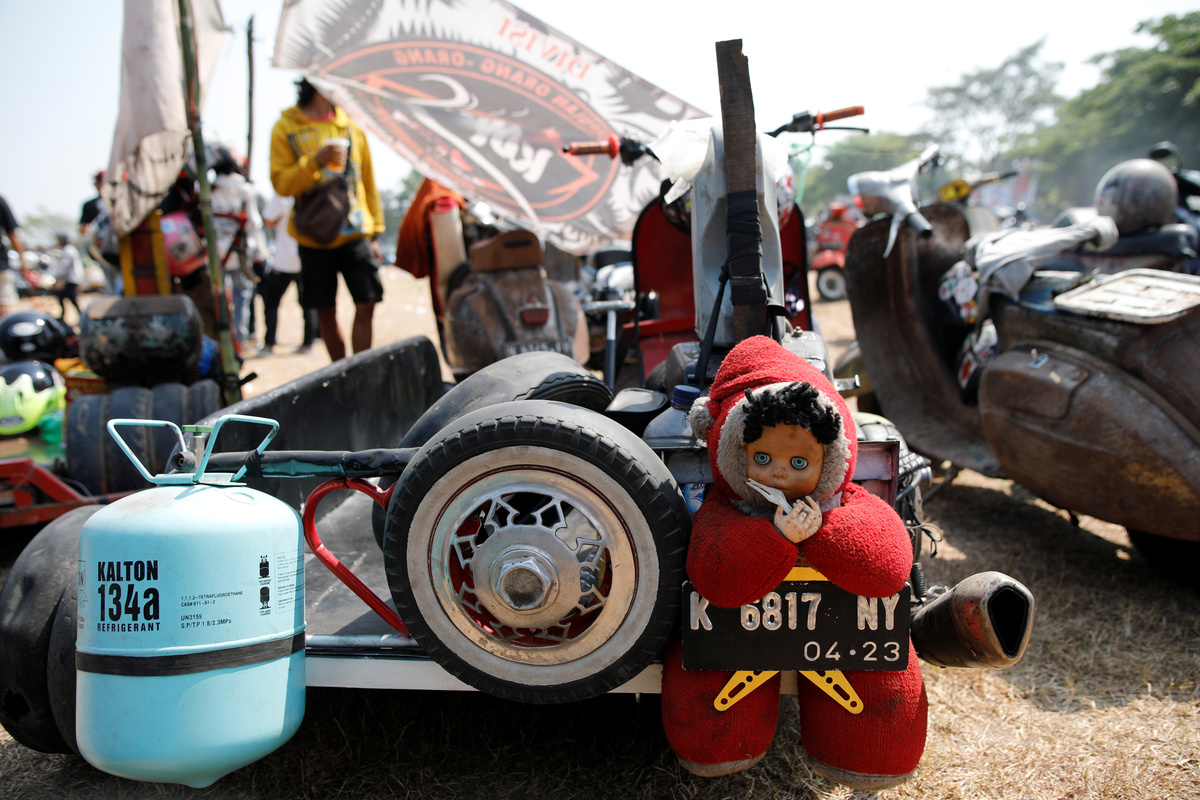 Hundreds of enthusiasts travel to the festival in Kediri to show off their creations – ranging from restored vintage Vespas to Mad Max-style tanks fitted with fake machine guns, a dozen extra tyres, or eerie stuffed toys as hood ornaments. (Click https://reut.rs/2PAoAGT to see a picture package of 'extreme' Vespa enthusiasts at the festival.)