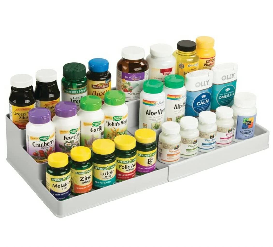 Instead of jamming all your vitamins, spices, or cosmetics into a cupboard and digging around in there when you need something, set them on this three-tier shelf organizer so you can see them all at once. There are two sizes, each expanding to fit your cupboard or shelf. Choose from four color options to create the look you want.