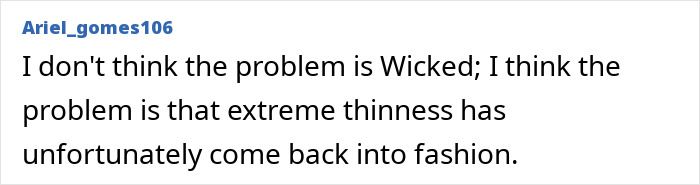 A third added a wider cultural critique: “I don’t think the problem is Wicked. I think the problem is that extreme thinness has unfortunately come back into fashion.”
