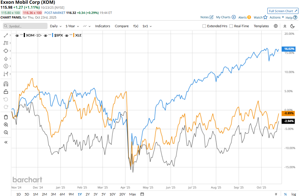 XOM stock prices have declined 3.6% over the past 52 weeks, notably lagging behind the Energy Select Sector SPDR Fund’s (XLE) marginal 94 bps dip and the S&P 500 Index’s ($SPX) 16.2% gains during the same time frame.