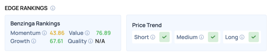 Benzinga Edge Rankings: Benzinga Edge Rankings highlight the stock’s strong fundamentals, giving it a high Value score of 76.89 and a solid Growth score of 67.61.