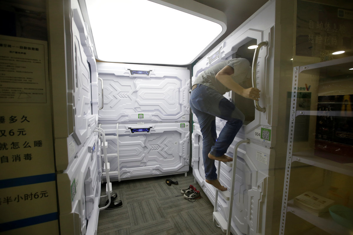 A man climbs up a ladder as he prepares to sleep in a capsule bed unit at Xiangshui Space during lunch break in Beijing's Zhongguancun area, China July 11, 2017. REUTERS/Jason LeeInner view of a capsule bed unit is pictured at Xiangshui Space in Beijing's Zhongguancun area, China July 11, 2017. REUTERS/Jason LeeA man uses an application to open a capsule bed unit at Xiangshui Space during lunch break in Beijing's Zhongguancun area, China July 11, 2017. REUTERS/Jason LeeAn IT employee takes off shoes as he prepares to sleep in a capsule bed unit at Xiangshui Space during lunch break in Beijing's Zhongguancun area, China July 11, 2017. REUTERS/Jason Lee Shoes are placed outside capsule bed units at Xiangshui Space during lunch break in Beijing's Zhongguancun area, China July 11, 2017. REUTERS/Jason LeeA woman checks the capsule bed unit next to a staff member at Xiangshui Space during lunch break in Beijing's Zhongguancun area, China July 11, 2017. REUTERS/Jason LeeOffice workers are interested in the capsule bed units at Xiangshui Space during lunch break in Beijing's Zhongguancun area, China July 11, 2017. REUTERS/Jason Lee