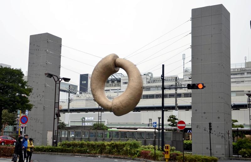 When you come out the north exit of JR Kinshicho Station in Sumida Ward, Tokyo, a circular gold object can be seen. Hung by wires from two pillars, it looks like a huge doughnut floating in the air. What does this represent?