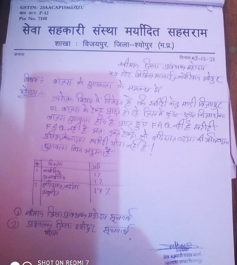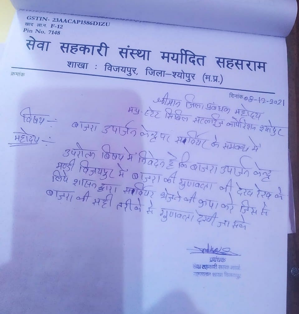 मुन्नालाल धाकड़ न्यूज़लॉन्ड्री से एक पत्र साझा करते हैं, जो मध्य प्रदेश स्टेट सिविल सप्लाईज कॉर्पोरेशन श्योपुर के जिला प्रबंधक (डीएमओ) को लिखा गया है. 9 दिसंबर 2021 को लिखे गए इस पत्र का विषय, ‘बाजरा के गुणवत्ता के संबंध में’ है. पत्र में लिखा है, ‘‘खरीदी केंद्र में कुछ-कुछ किसानों का बाजरा गुणवत्ताहीन है, जिसके कारण हम खरीदारी रोक रहे हैं.’’