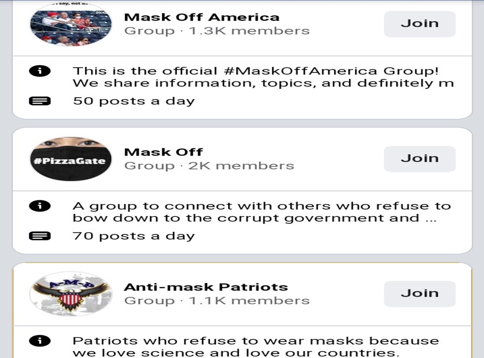 Many of the groups are specific to individual US states or towns, while others seek to spread misinformation on a broader scale. Names for these pages include “Christians against face masks”, “Unmask America”, “Free Face Society”, and “Anti-Mask Lives Matter”.