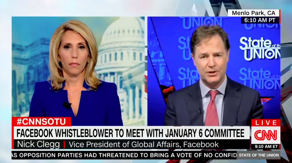 The Facebook vice-president for global affairs, and former UK deputy prime minister, was asked directly by host Dana Bash if the company’s algorithms “amplify pro-insurrection voices ahead of 6 January?”
