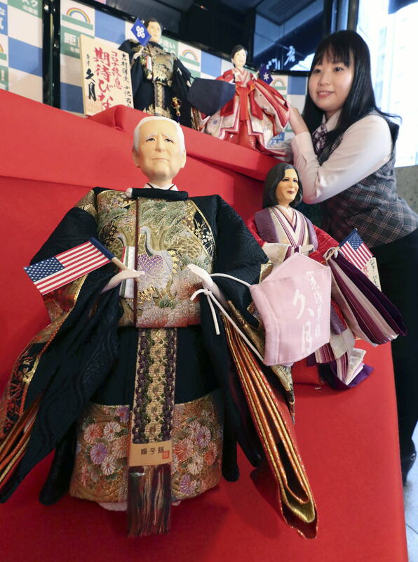 Hina dolls of newly elected U.S. President Joe Biden and Vice President Kamala Harris are displayed in the shop of famous doll maker Kyugetsu Co. in Taito Ward, Tokyo, on Wednesday, ahead of the Hina Matsuri doll festival on March 3. The firm, which singles out people expected to be in the news this year, selected the two in the hope that the change in the U.S. administration will lead to a "restoration of world order." The dolls are not for sale, and will be on display through Friday.