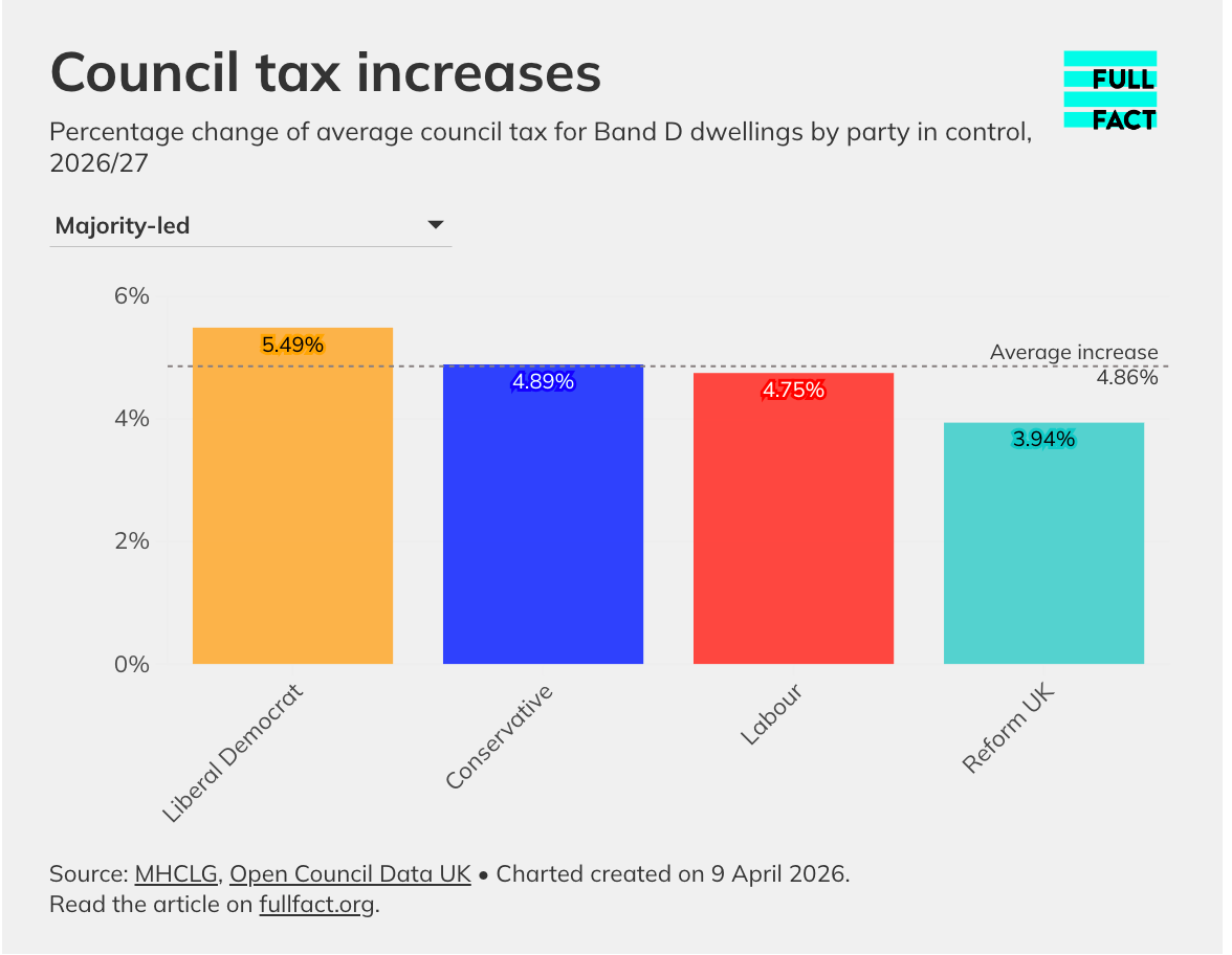 Reform claims to have delivered the lowest average council tax increase of any major party, at 3.94%. Looking specifically at upper-tier councils where one party has majority control, this is correct. The nine upper-tier councils controlled by a Reform majority increased Band D council tax for 2026/27 by an average of 3.94%—lower than the overall average increase of 4.86%.