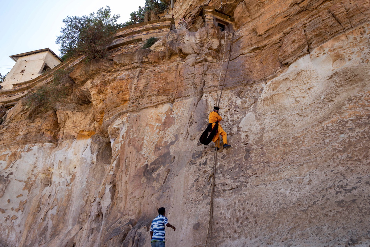 The monastery, famous for its its collection of ancient manuscripts, is believed to have been founded in the 6th century. Only men are permitted to visit; they must climb a rope up a 15-meter cliff to reach the top of the flat-topped mountain it is built upon.