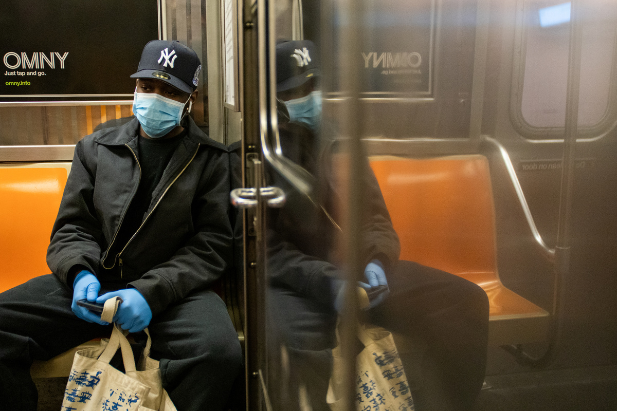 A man in a surgical mask rides on the subway in the Brooklyn borough, following the outbreak of the coronavirus disease (COVID-19), in New York City, U.S., March 15, 2020. REUTERS/Jeenah Moon