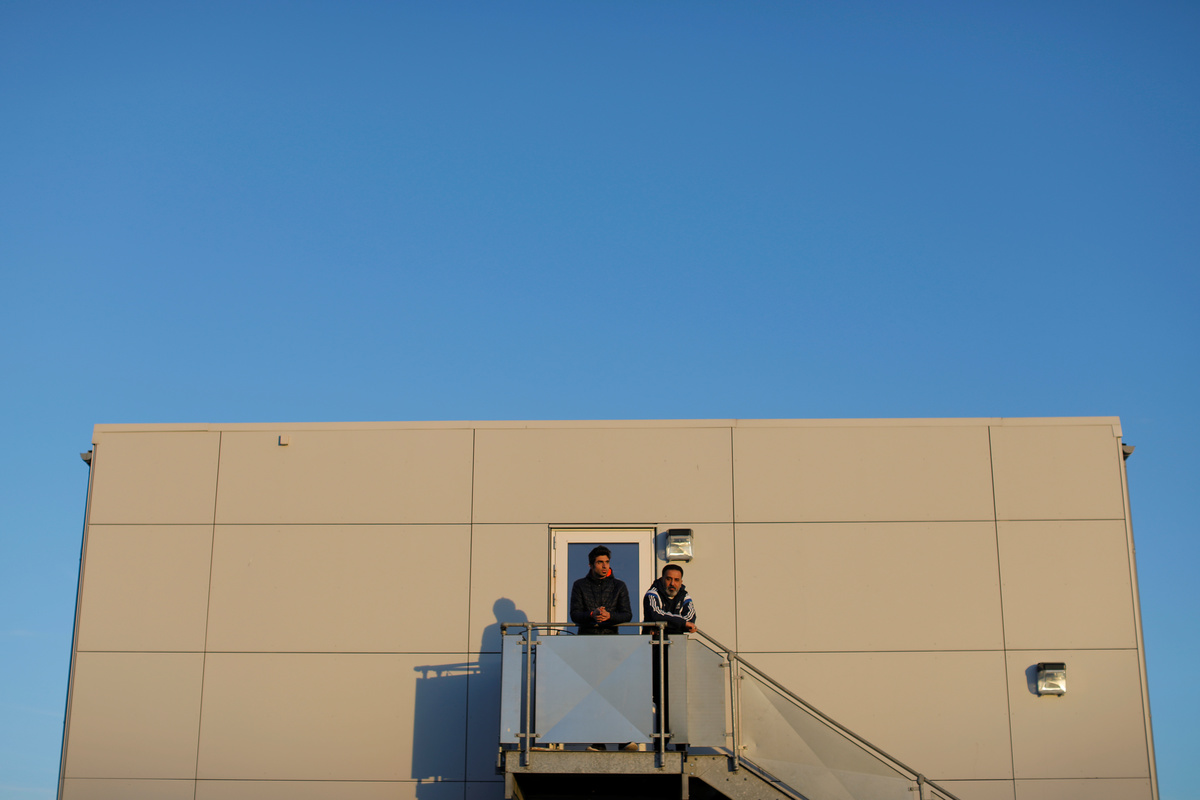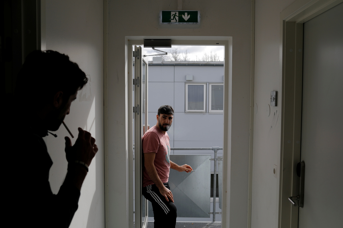 Saman Najafi, a Kurdish asylum seeker, and Ali Kadhem Al-Enzi, stateless from Kuwait, stand at the entrance to a block of residences for males at Kaershovedgaard, a former prison and now a departure centre for rejected asylum seekers in Jutland, Denmark, March 25, 2019. REUTERS/Andrew Kelly