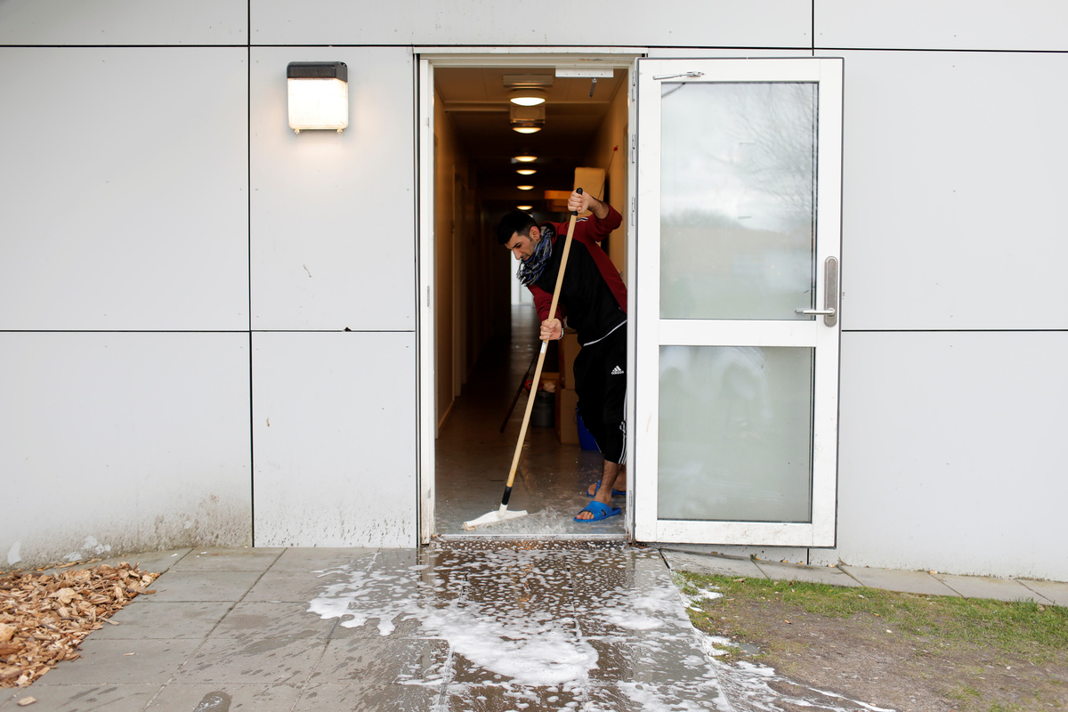 Deler Haidari, 29 from Iran, cleans the hall outside his room at Kaershovedgaard, a former prison and now a departure centre for rejected asylum seekers, in Jutland, Denmark, March 26, 2019. REUTERS/Andrew Kelly