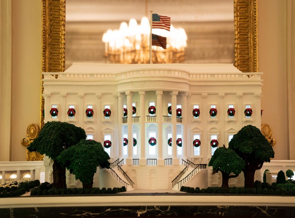 In the State Dining Room sits the traditional 275lb gingerbread White House, this year including not just the mansion, east and west wings, but also the First Ladies’ Garden and the Rose Garden, designed by Jackie Kennedy and controversially made over by Ms Trump earlier in the year.